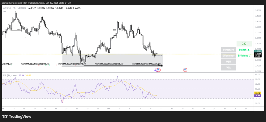 The XRP/USD 4-hour chart is bullish and efficient despite XRP losing 7% of its value this week. Its price faced rejection from the upper trendline boundary since last week and has lost 8% of its value by Thursday. The poor performance saw XRP close below the 100-day Exponential Moving Average (EMA) at $2.85. At press time, XRP is trading at $2.808 per coin.