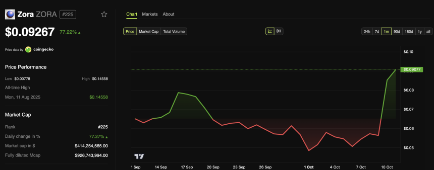 ZORAs price has skyrocketed by 77% in a single day, reaching its highest level in six weeks after de