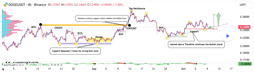 Meanwhile, volume trends continue to support the bullish case. On-chain activity shows consistent inflows to non-exchange wallets and steady liquidity retention near current levels. If Dogecoin maintains its support above $0.24, analysts anticipate a breakout toward $0.30, marking a 40% upside move in the near term. Sustained momentum above that range could extend gains toward the 2021 highs over the coming months.