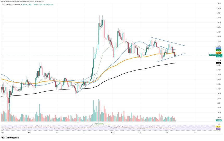 With its current price around $2.81, XRP has maintained a strong hold above the 200-day moving average, which has served as a long-term support throughout 2025, and is currently trading around $2.64. The combination of this stable base-building phase and tightening price action suggests consolidation rather than a decline.