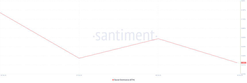 ETHs price decline since the beginning of the week has triggered a lackluster attitude toward it from investors, and this is reflected by the dip in its social dominance since then. According to Santiment, this metric currently stands at 6.48%, down by 5% in the past five days.