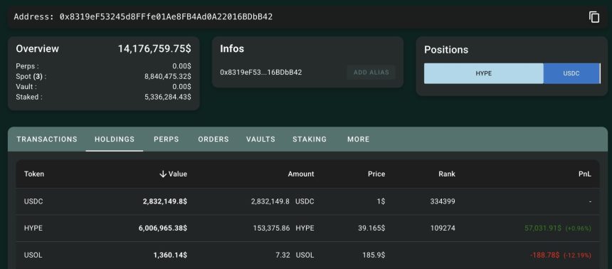 On-chain data reveals that the wallets total holdings now stand above $14 million, with a major portion allocated to HYPE, making it one of the largest whale positions in the token.