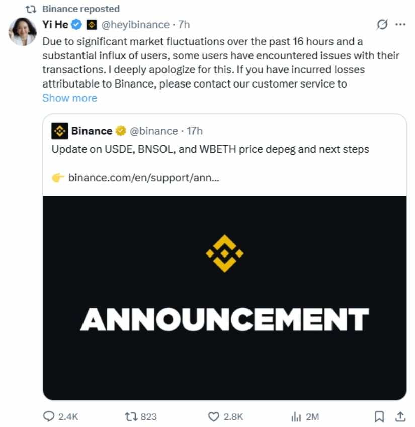 Binance co-founder Yi He apologized to users on Saturday morning. She explained that problems arose from extreme market volatility combined with a huge influx of users to the platform. This caused the exchanges systems to experience performance issues.