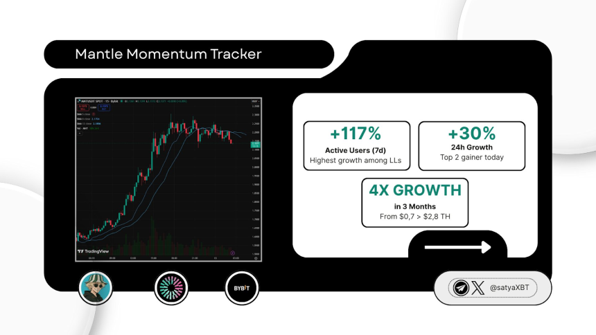 Mantles active addresses soared 117% week over week, marking the “strongest growth among all L2s,” according to blockchain sleuth SatyaXBT.