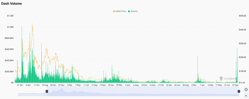Dashs daily trading volume in October reached a record high of over $600 million. Data from CoinGecko shows that the current daily volume remains in the $200–$300 million range, 10 times higher than at the beginning of the month.