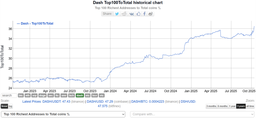 Data from BitInfoCharts shows that the top 100 addresses have increased their DASH holdings from 25% of the total supply in early 2025 to more than 36%, marking a 10-year high.