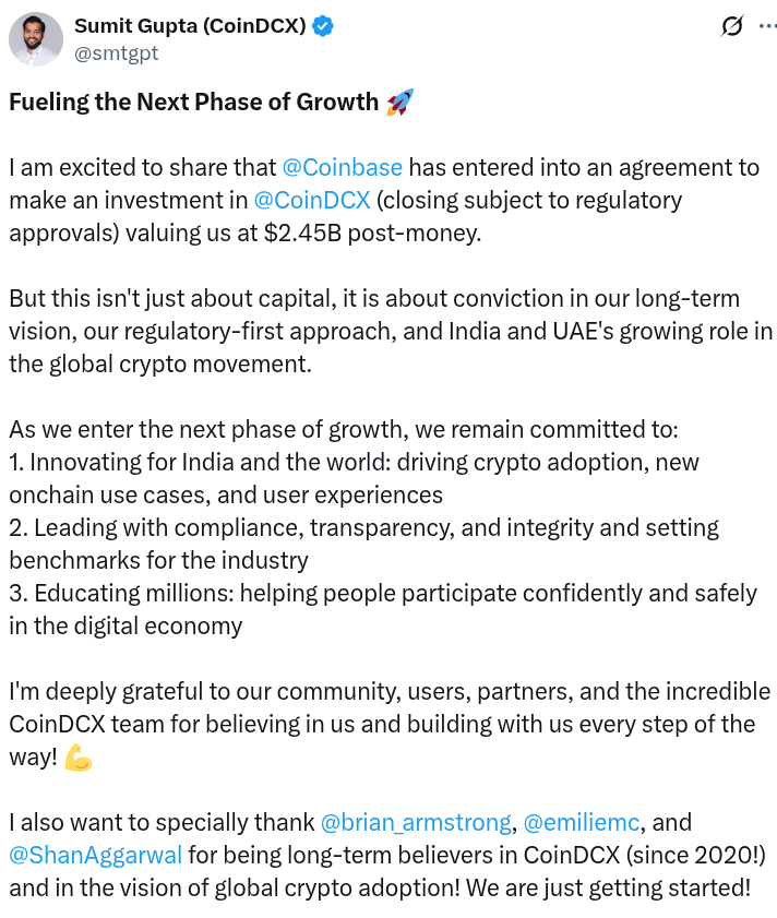 According to a Wednesday Coinbase announcement, the placement was made through the exchanges investment arm, Coinbase Ventures. CoinDCX co-founder and CEO Sumit Gupta wrote in an X post that the investment took place at a post-money valuation of $2.45 billion.