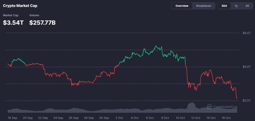 CoinMarketCap data showed that on Friday, the total crypto market capitalization dropped to about $3.54 trillion, a 6% drop from $3.78 trillion the previous day. This wiped out over $230 billion in value from the sector, marking one of the sharpest single-day declines in months.