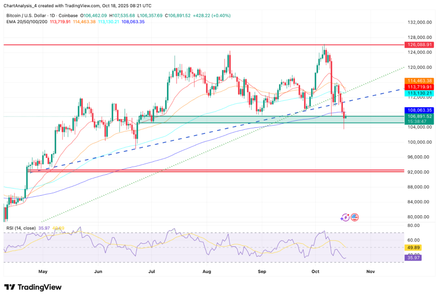 Bitcoin price today is consolidating near $106,900, with buyers attempting to hold the $105,000–$104,000 support range after a volatile week. The move comes after BTC briefly broke below its 200-day EMA cluster, prompting speculation over whether the correction is ending or just beginning.