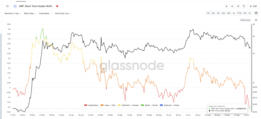 For XRP, the short-term holder NUPL has now dropped to a one-year low of –0.20 as of October 17, with the token trading near $2.30.