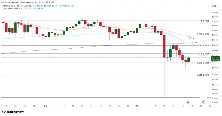 The XRP price trades near $2.35 at press time. A daily close above $2.44 would mark the first sign of strength, while a confirmed move above $2.59 — near the 200-day EMA — could clear the way toward $2.82 and $3.10.