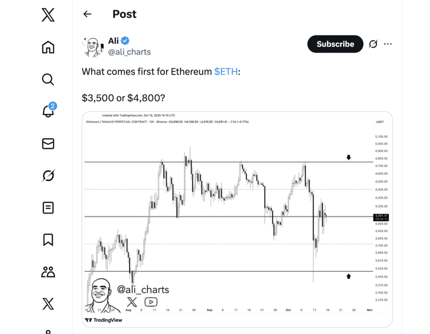 Ethereum (ETH)continues to hold above $3,500 while facing strong resistance near $4,800. Analysts believe that whichever side breaks first could define Ethereums trend for the next few months. A move above$4,800 may trigger a rally toward $5,200 or $6,000,while losing $3,500 could pull the price back to $3,200.