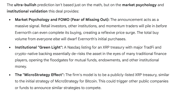 However, it‘s too early to tell whether XRP will see a similar effect. To assess what could happen, we asked Google Gemini for a hypothetical, bullish scenario if Evernorth’s effort succeeds.