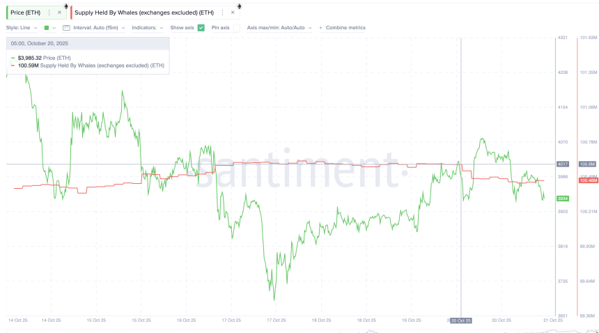 Ethereum price has spent most of October struggling to build strength above $4,000. Despite holding its broader uptrend, ETH trades around $3,935 at press time, down 6.6% this week, showing hesitation as Bitcoin recovers.