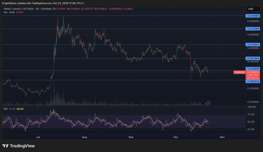 Stellar‘s XLM tumbled 5% on Tuesday, falling from $0.3284 to $0.3119 after breaking below a critical $0.32 support level that had held for weeks. The drop marked one of XLM’s sharpest declines in recent sessions, underscoring renewed bearish momentum in a market driven largely by technical factors rather than fundamentals.