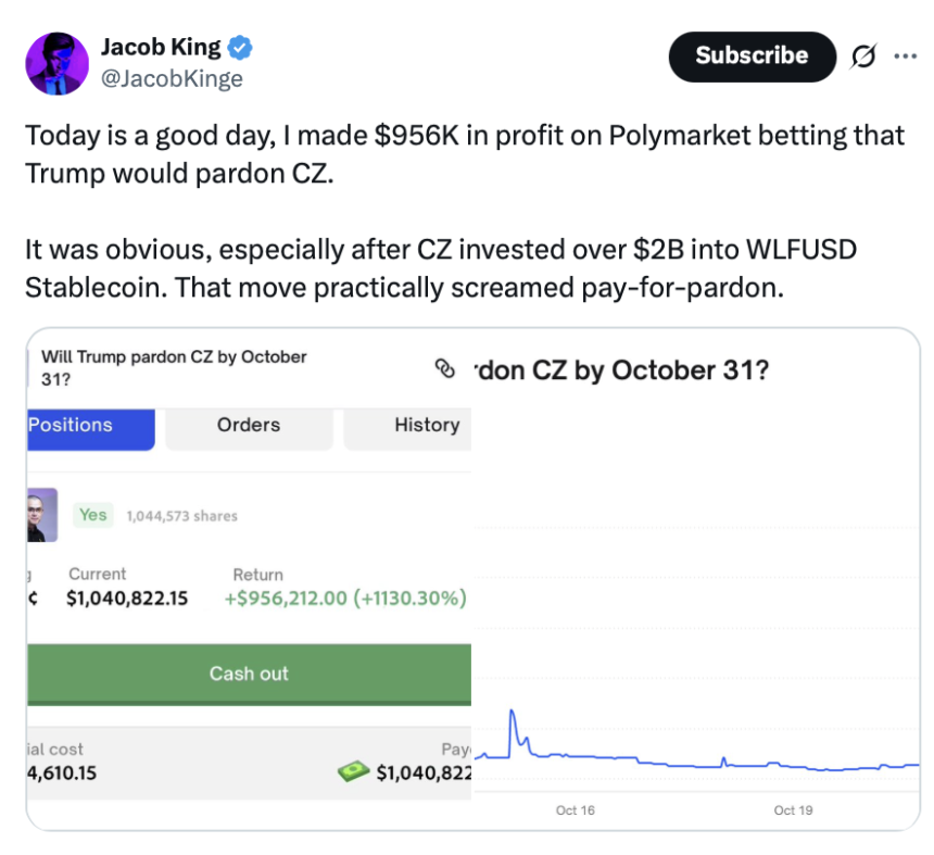 Swan Desk CEO Jacob King said in an X post on Thursday that the pardon “was obvious,” revealing that he made $956,000 in profit betting that Trump would pardon Zhao.