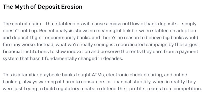 But many in the crypto space see it differently. On Sept. 16, Coinbase published a blog post arguing that “institutions now warning of ‘systemic risk’ are the same ones pocketing tens of billions from card processing fees, which stablecoins could bypass entirely.”
