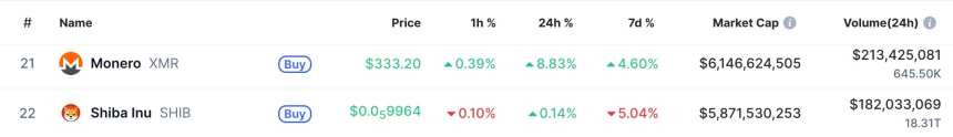 Privacy coin Monero (XMR) suddenly demonstrated a 8.22% price uptick inside the day, trading at $331.52 and lifting its market capitalization to $6.11 billion. Thanks to this move, Monero claimed 21st place on CoinMarketCap, pushing Shiba Inu (SHIB) down with $5.87 billion.