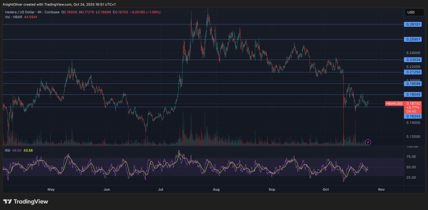 WikiBit 2025-10-25 00:01Hederas HBAR token slipped 1.7% over the past 24 hours, retreating from $0.1669 to $0.1697 after a f