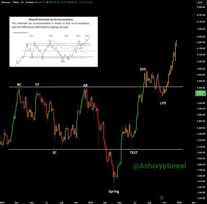 According to market analysts, Ethereum develops a Wyckoff-style re-accumulation pattern. Crypto analyst Ash Crypto reported that ‘’ETH is moving toward the markup phase.‘’