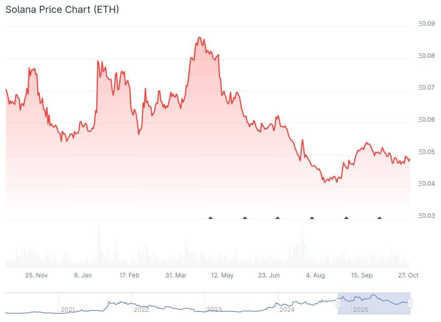 CoinGecko data shows that in the first half of 2025, Ethereum declined 25.0% while Solana dropped 19.1%. However, Solana outperformed Ethereum by 26.2% in January before both assets faced broader market pressure.