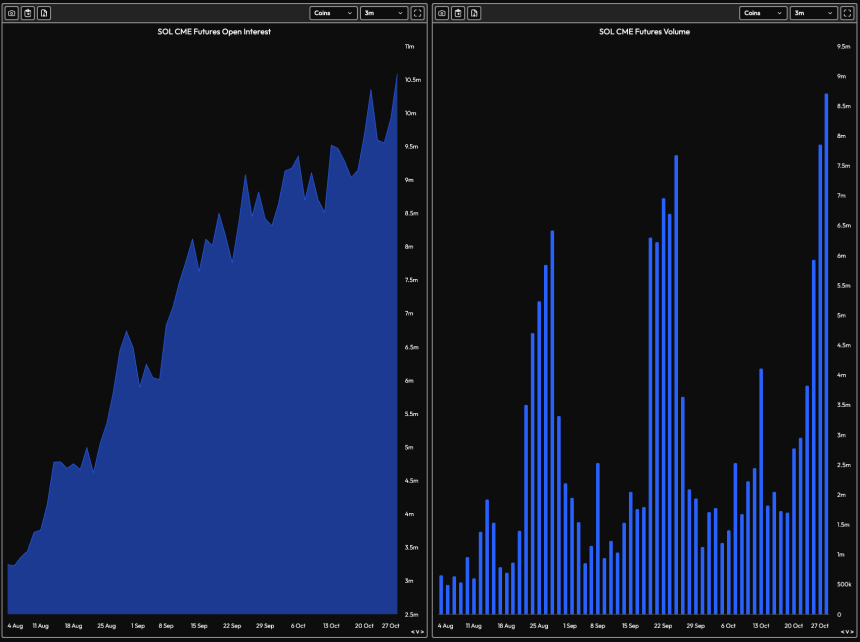 SOL CME futures open interest and volume (coins). 3-months. Source: Velo.xyz