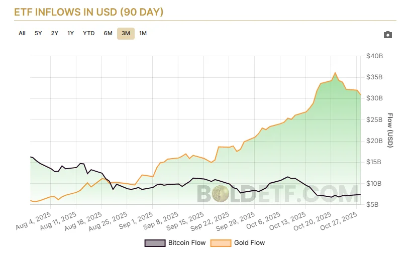 WikiBit 2025-10-30 02:03The inflows of funds into BTC and gold diverged, just as gold prices entered correction territory. B