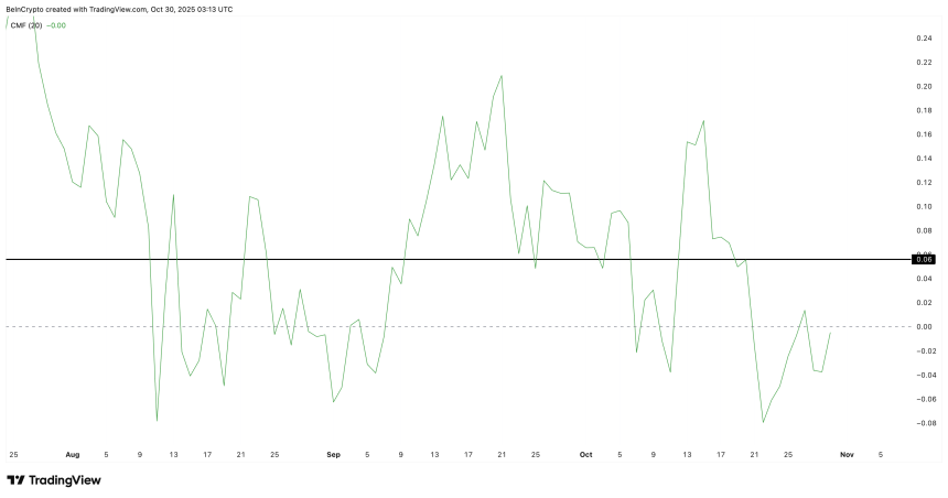 The Chaikin Money Flow (CMF) — a tool that measures big-money inflows and outflows — adds to this view. After briefly rising above zero on October 27, CMF turned negative again and has failed to recover since. That means institutional buyers are not adding aggressively, even after recent dips.
