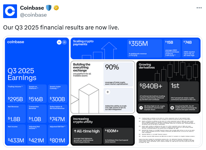 Institutional revenue continues to dominate Coinbase trading activity, accounting for 80% of the $295 billion trading volume in Q3, while its assets under custody surpassed $300 billion, setting another all-time high.