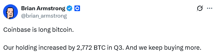 WikiBit 2025-10-31 07:32Coinbase boosted its Bitcoin holdings by 2,772 BTC in Q3 amid a strong quarter of earnings, advancing its vision to become an Everything Exchange.
