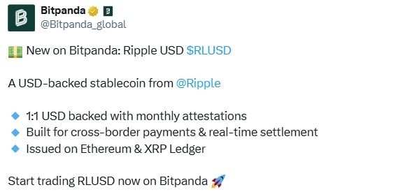 Ripples RLUSD is fully collateralized with U.S. dollars on a 1:1 basis and undergoes monthly attestations to ensure transparency. The company stated that the stablecoin is designed specifically to support cross-border transactions and real-time settlement, addressing a long-standing friction point in global payments. RLUSD operates on both the Ethereum and XRP Ledger networks, broadening its interoperability and appeal among users seeking fast, low-cost transfers. Bitpanda noted: “RLUSD is not available for EEA users,” indicating regulatory or regional restrictions on access within the European Economic Area.