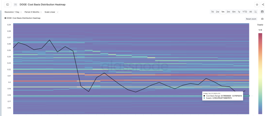If this crossover confirms, it would signal deepening downside momentum and strengthen the bearish structure already in place. In that case, Dogecoins strongest support zone near $0.17, highlighted by its cost basis heatmap, could finally give way — opening the door to a fall toward $0.14. That would be a near 6% dip.