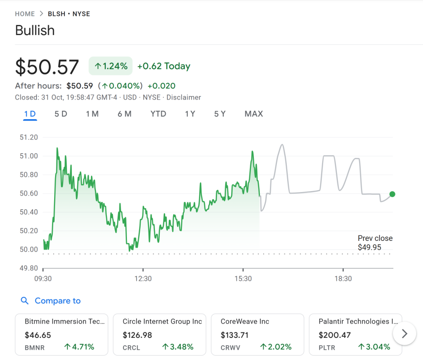 Bullish shares gain 1.2% on Friday. Source: Google Finance
