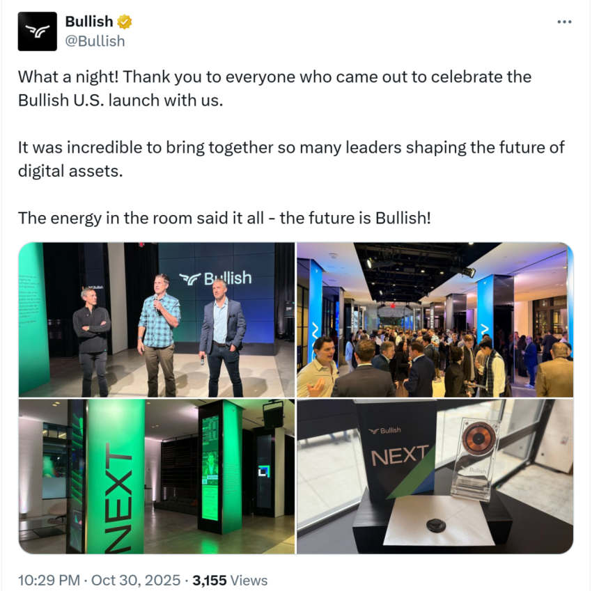 The purchases coincided with Bullishs US launch event in New York, where the company brought together digital asset leaders to celebrate its expansion. “The energy in the room said it all — the future is Bullish,” the firm posted on X following the event.