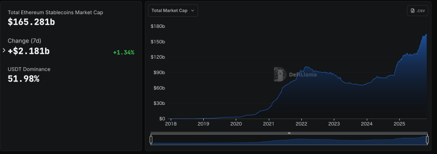Ethereum‘s ecosystem continues to draw attention as stablecoins on its blockchain reach approximately $165 billion in reserves, positioning it among the world’s largest.