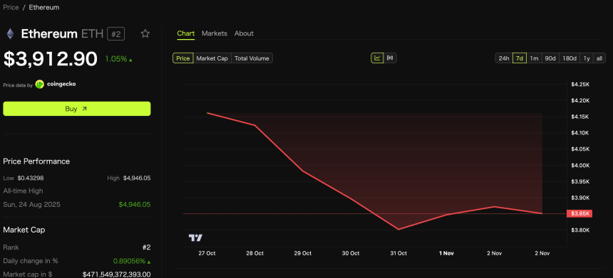 Amid these developments, Ethereums spot price has shown weakness. On October 29, ETH fell below US$4,000; at the time of writing, it stood at $3,912.90. The market appears to be waiting for confirmation of macro narratives, including continued stablecoin flows and increased network activity, before accelerating upward.