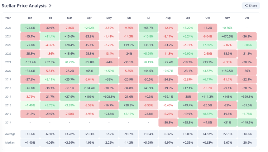 Historically, November has been unpredictable for Stellar. The tokens average gain of +58% looks impressive, driven by massive rallies like +470% in 2024 and +159% in 2020.