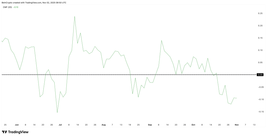 However, when zooming out to the two-day chart, the CMF still sits near -0.10, indicating that large holders and possibly institutions have not yet returned in force.