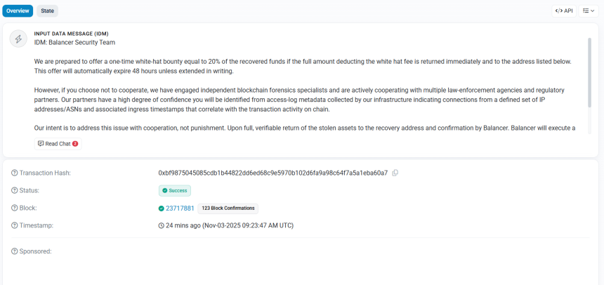 Aiming to recover the funds, the team behind Balancer offered a white hat bounty of up to 20% of the stolen funds if the full amount, minus the reward, is returned immediately.