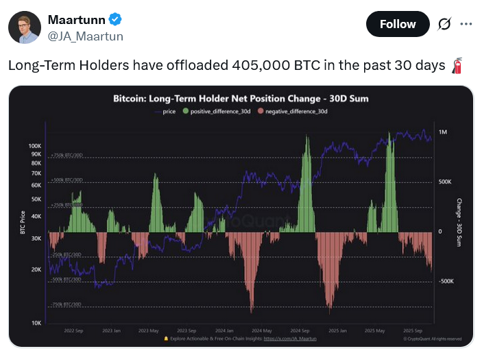 Data from CryptoQuant also shows that long-term holders offloaded 405,000 Bitcoin from about Oct. 2 to Nov. 2.