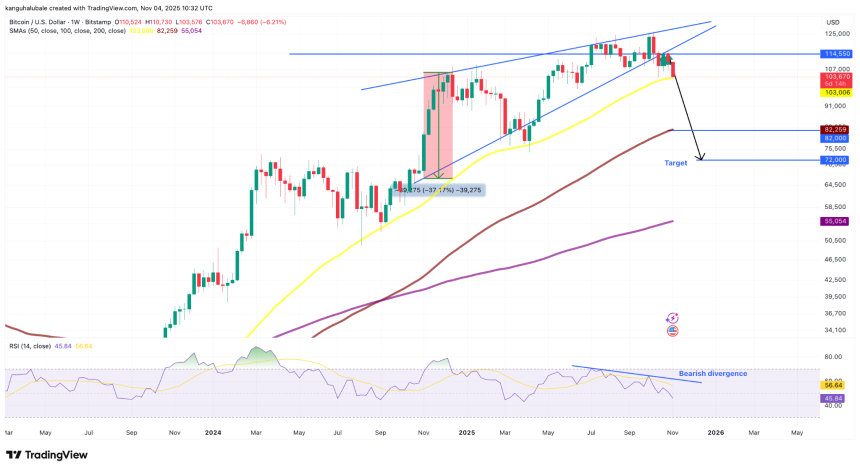 A weekly close below this area will clear that path for BTC‘s drop toward the wedge’s target at $72,000, representing a 30% decline from the current price.