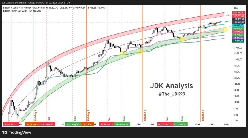 BTC/USD monthly chart with Power Law Model. Source: JDK Analysis
