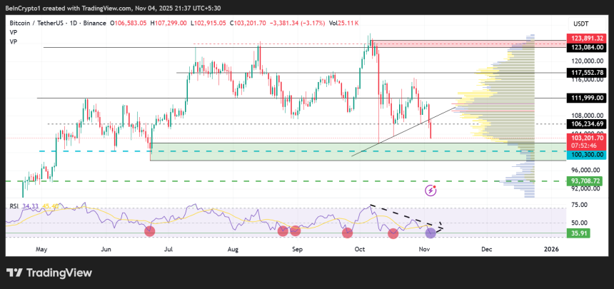 Meanwhile, Bitcoin continues to slide lower after descending to the $103,000 range on Tuesday. Prospects for further downside remain very much alive, with concerning actions by significant market players keeping traders on edge.