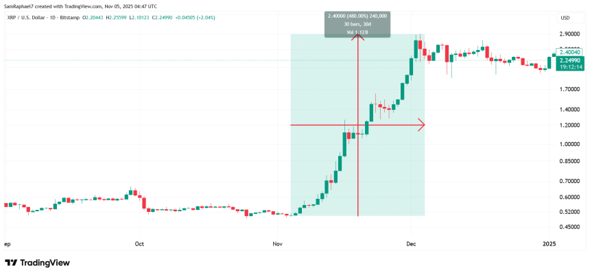 Specifically, after Donald Trumps election victory on Nov. 4, 2024, XRP, which traded for $0.50, experienced an impressive surge on the back of a market run. By Dec. 3, 2024, XRP had reached a peak of $2.9, its highest price in seven years at the time. Interestingly, this marked an impressive 480% increase within a month.