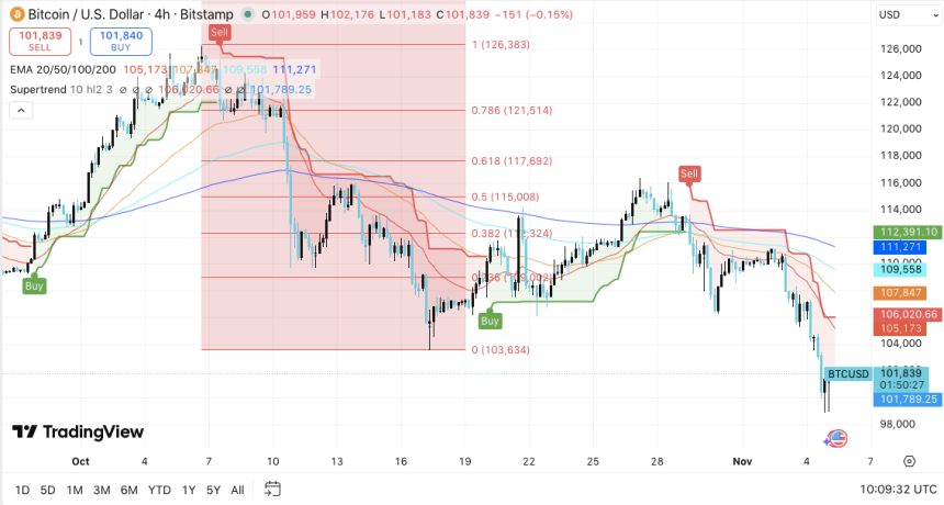 Bitcoin remains under the 20, 50, 100, and 200-exponential moving averages, confirming a prevailing downtrend. The Supertrend indicator reinforces this bias, showing that recent recovery attempts have failed near resistance zones. The price now trades just above the critical $101,000–$100,000 support band, a region where buyers historically stepped in to defend against deeper declines.