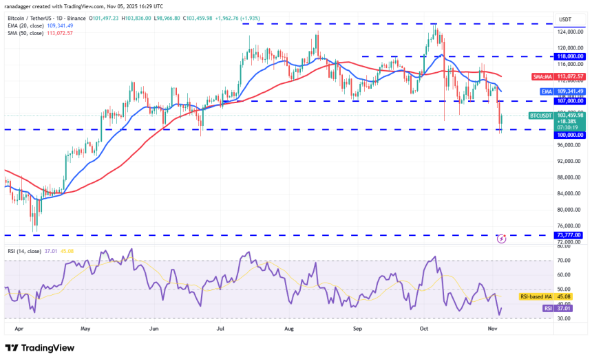 Buyers are fiercely defending the $100,000 level, but the recovery is expected to face selling at the breakdown level of $107,000 and then at the 20-day exponential moving average ($109,341). If the price turns down sharply from the overhead resistance, the risk of a break below $100,000 increases. If that happens, the BTC/USDT pair could plunge to $87,800.