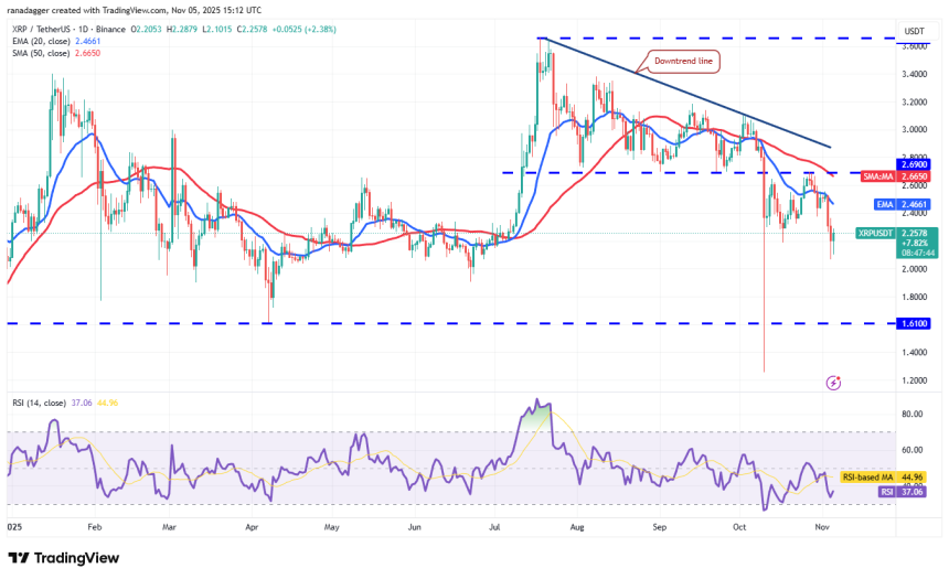 Any recovery attempt is expected to face selling at the 20-day EMA ($2.46). If the price turns down sharply from the 20-day EMA, the XRP/USDT pair could plummet toward the crucial support at $1.61. Buyers are expected to fiercely defend the $1.61 level, as a break below it may sink the pair to $1.25.