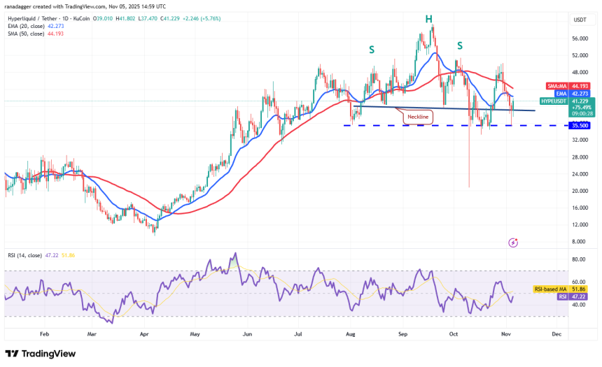 The relief rally is expected to face selling at the moving averages, but if the bulls prevail, the HYPE/USDT pair could climb to $52. Sellers will again attempt to halt the recovery at $52. If the price turns down from the overhead resistance, the pair could oscillate between $35.50 and $52 for a few days.