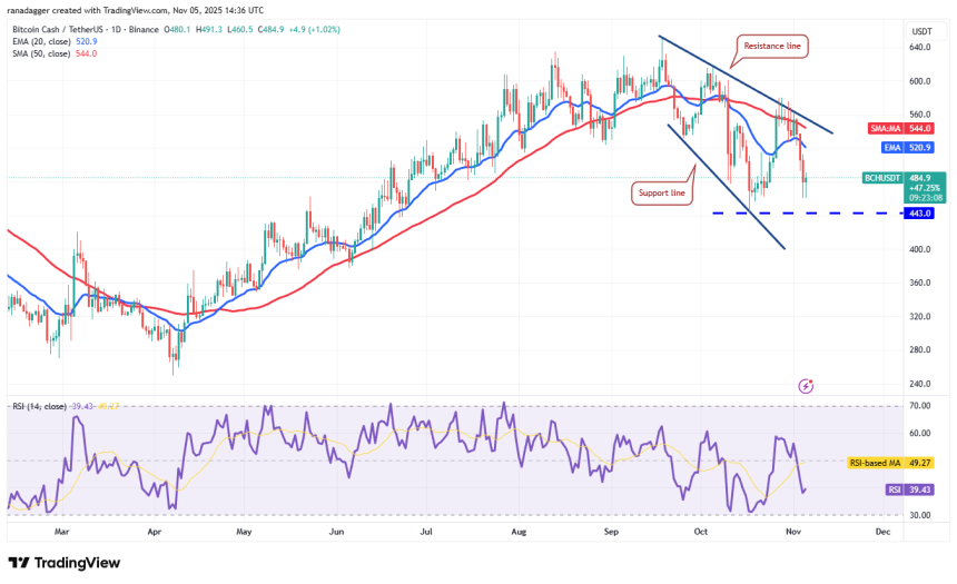 The bulls will try to defend the $443 level, but the recovery is expected to face selling pressure at the 20-day EMA. If the price turns down from the current level or the 20-day EMA, it suggests that the bears remain active at higher levels. The Bitcoin Cash price could then skid below the $443 level and reach the support line of the wedge.