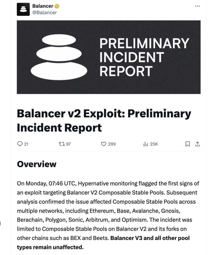 WikiBit 2025-11-06 03:54Decentralized finance protocol Balancer outlined the root cause of the recent $116 exploit and its ongoing response to the incident.